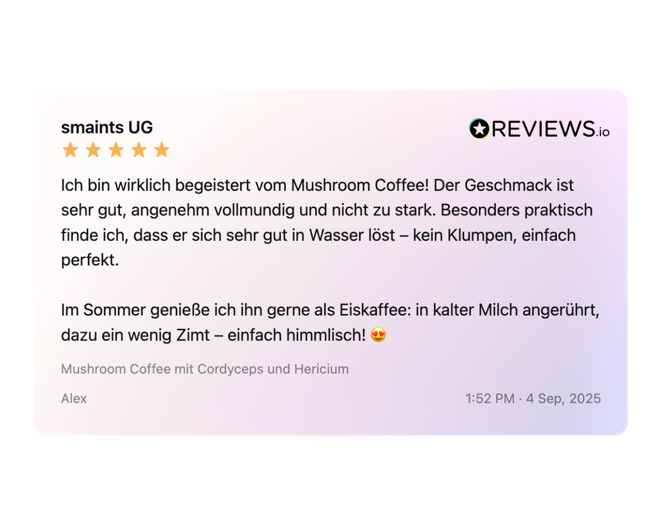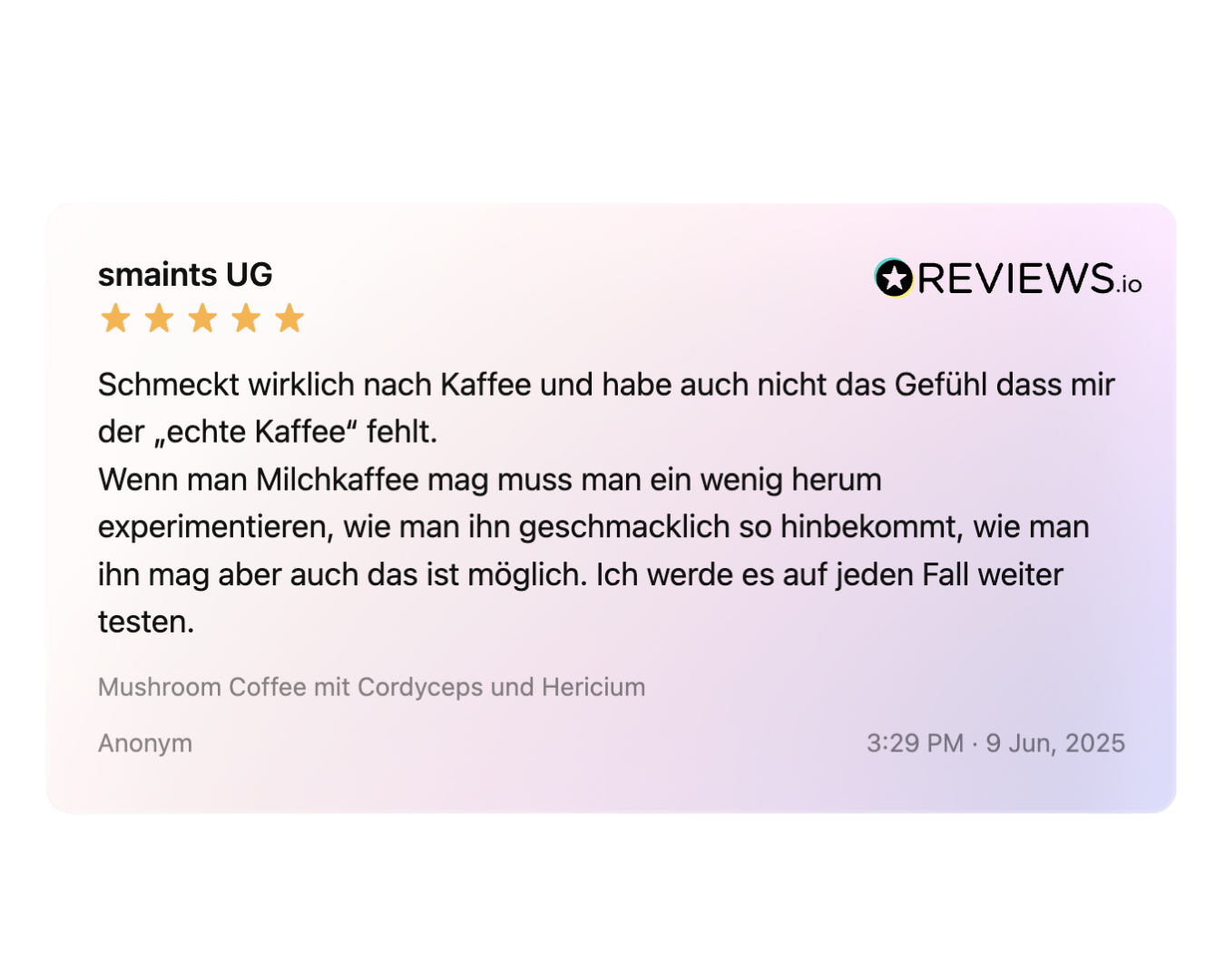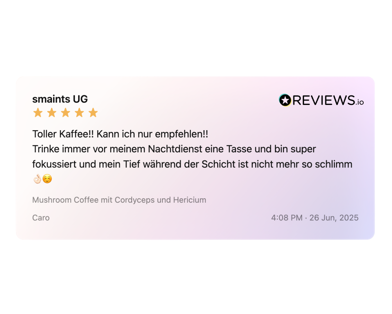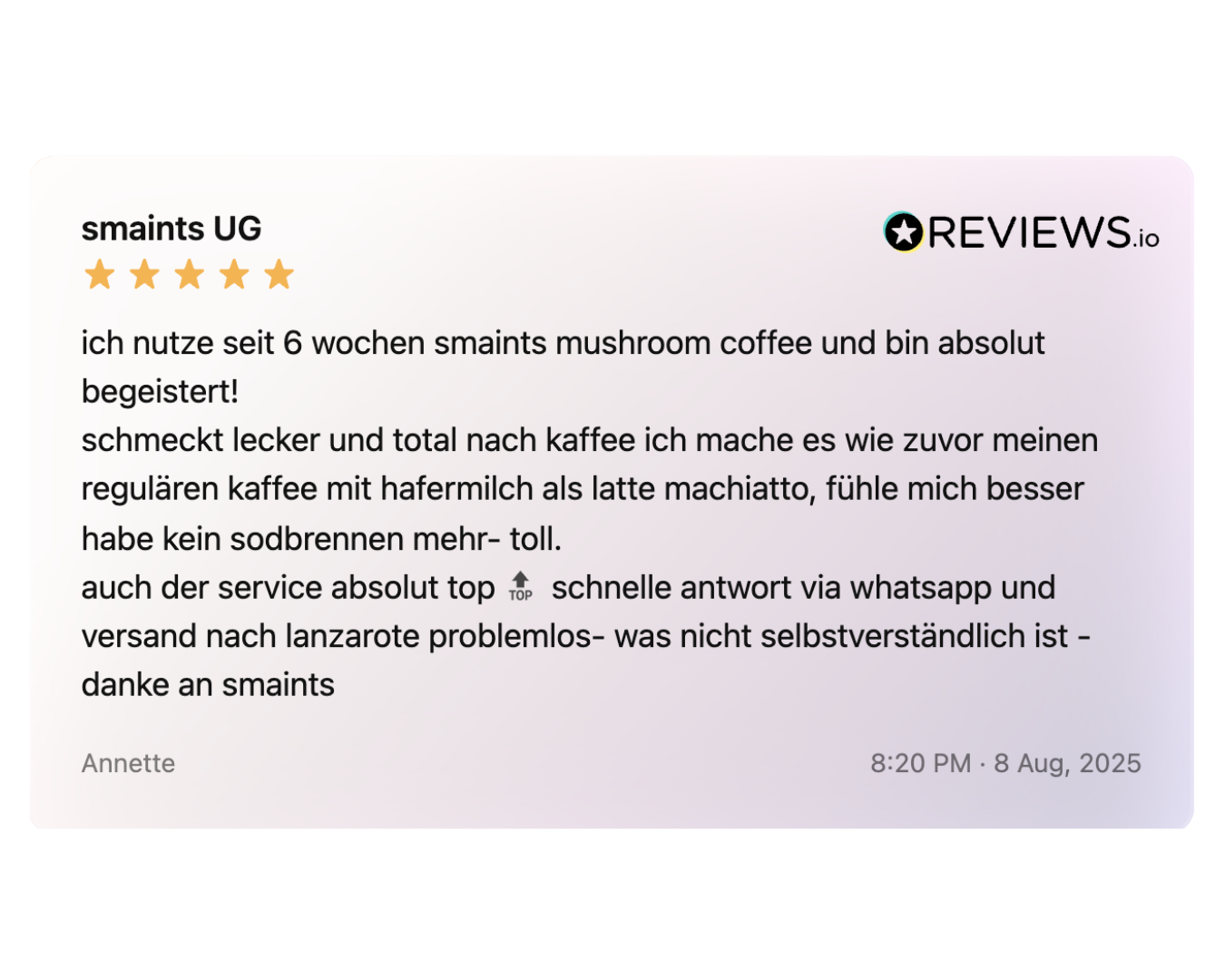 Der Mushroom Coffee ist der Zenit unserer Entwicklung. In ca 3000 positiven Bewertungen kannst du nachlesen, wie unsere Vitalpilz-Produkte Leben verändern. Jede Bewertung ist immer wieder ein großes Glücksgefühl für uns, das zeigt, dass wir unsere Mission erfüllen.
