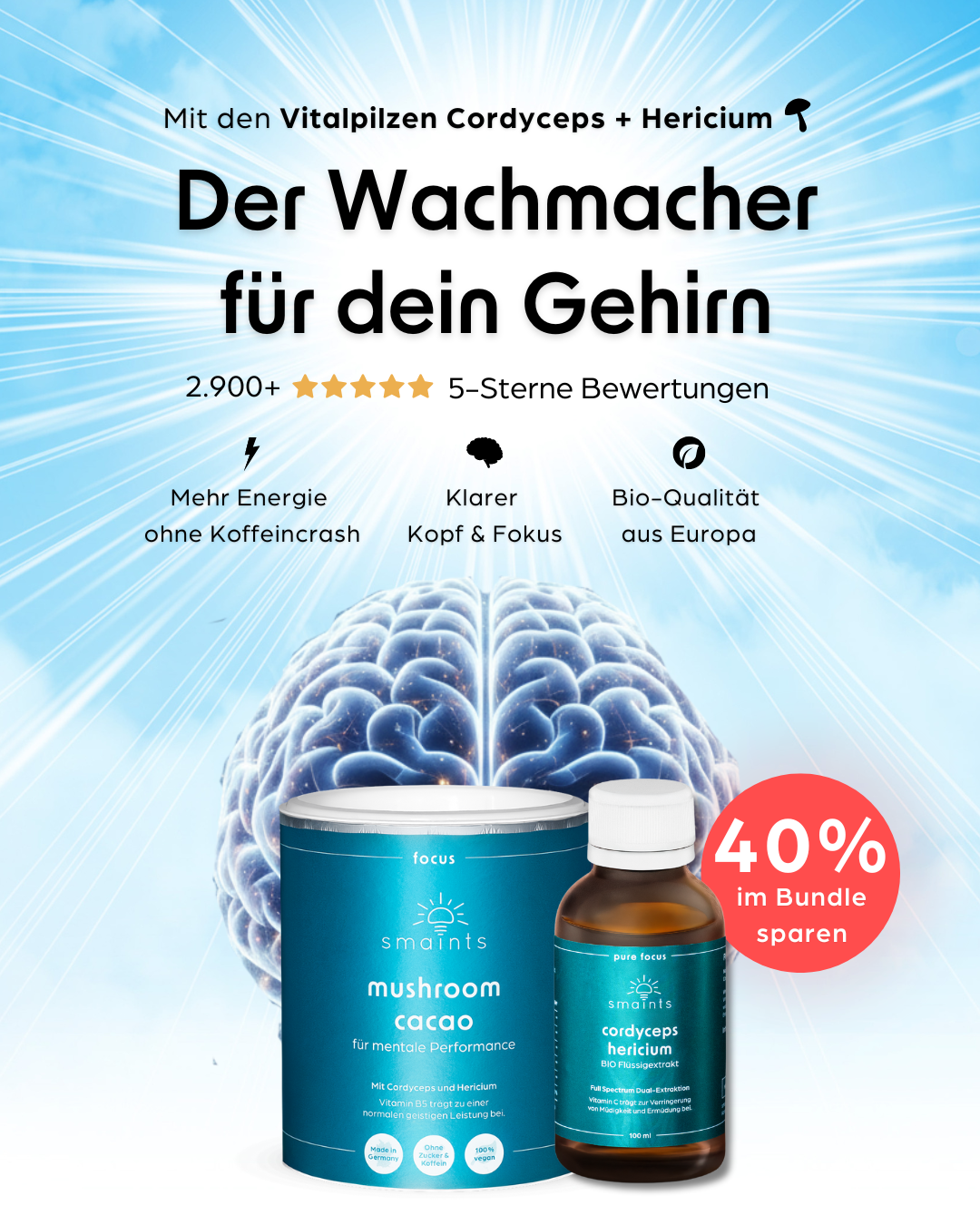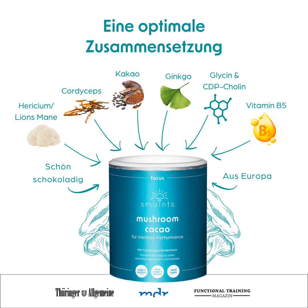 Wir haben nicht nur die effektivsten Vitalpilze Cordyceps & Hericium, sondern auch die effizientesten pflanzlichen Stoffe, wie Ginkgo biloba und CDP-Cholin miteinander kombiniert.