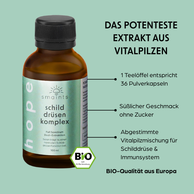 Hoffnung bei Hashimoto: Der erste Bio-Flüssigextrakt mit Vitalpilzen aus Europa und Selen. Jodfrei, laborgeprüft und speziell für die Schilddrüse entwickelt.